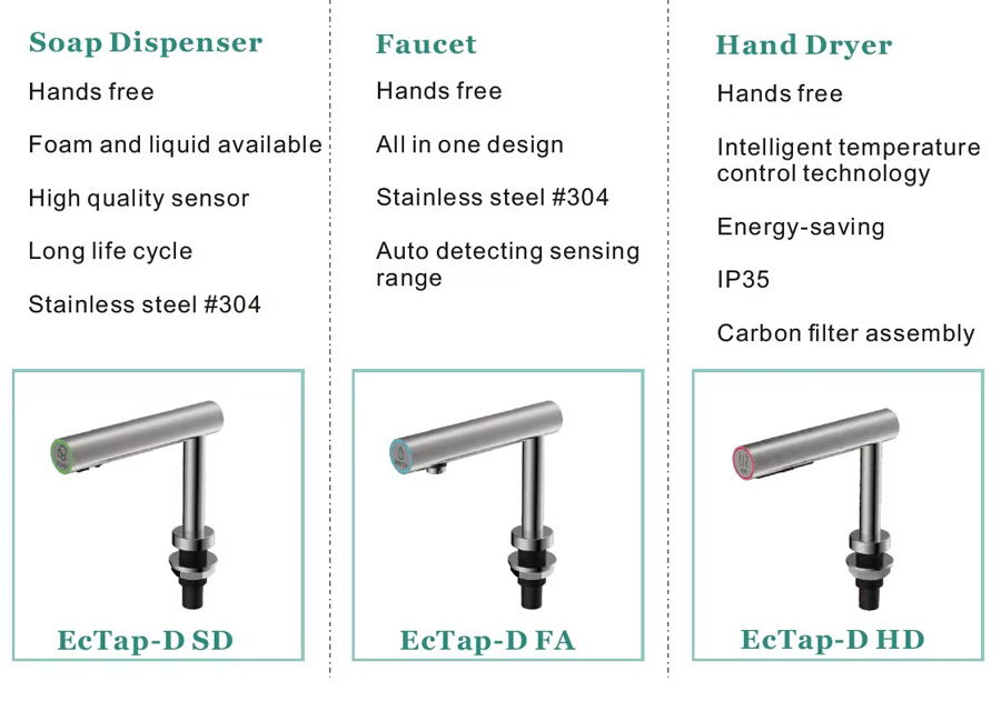 A quiet high speed hand dryer: The new patented air outlet reduced the noise level and increase the drying efficiency. EcoTap hand dryer is ideal for construction projects and automatic wash station. The customized design is also available.