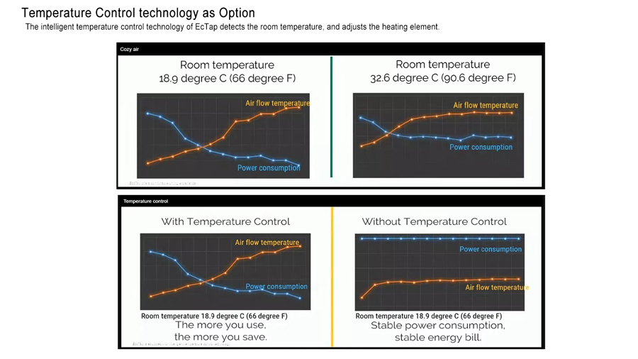 Optional intelligent temperature control function: It detects the room temperature, and adjust the heating element. Furthermore, the hand dryer automatically detects and uses the residual heat from the heater to reduce power consumption. The benefit is particularly apparent in high-traffic locations.