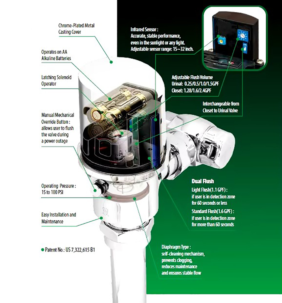1. Infrared Sensor for touchless use 2. Flushing Volume is adjustable 3. Manual Button design 4. Diaphragm valve with self-cleaning function 5. 24 hour Sentinel Flush 6. Long life 7. Splash-proof Construction |