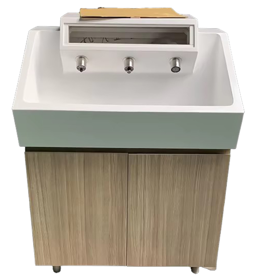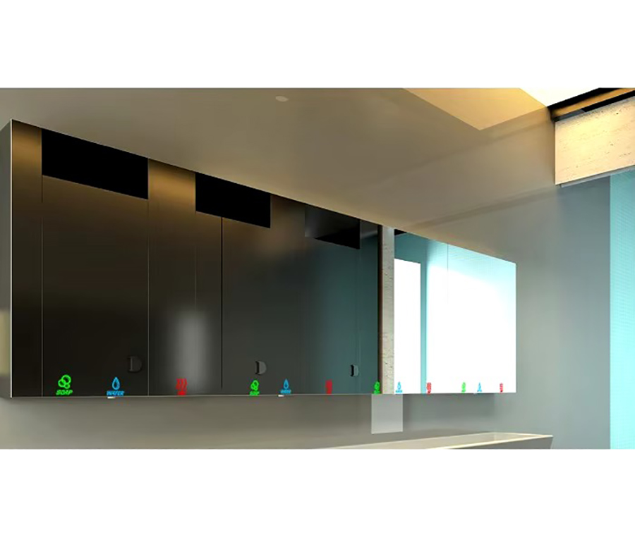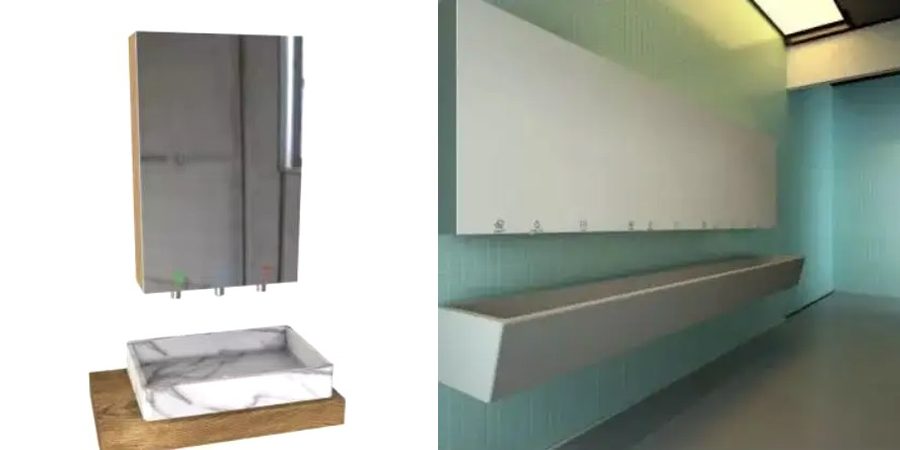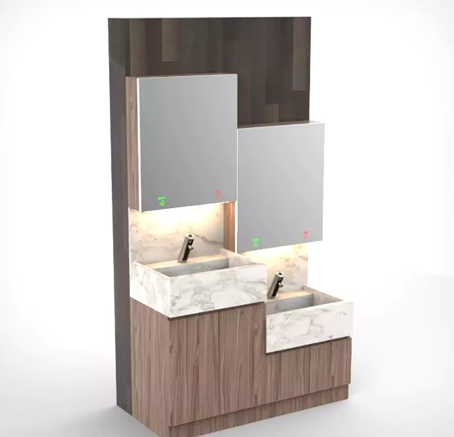 The idea of placing hygiene products behind a mirror to form a washing station has become trendy in recent years. Our washing station includes an auto hand dryer, an auto soap dispenser, and an auto faucet inside a mirror cabinet. This approach creates a neat and clean washroom space, and you can find this implementation already installed in several international airports.